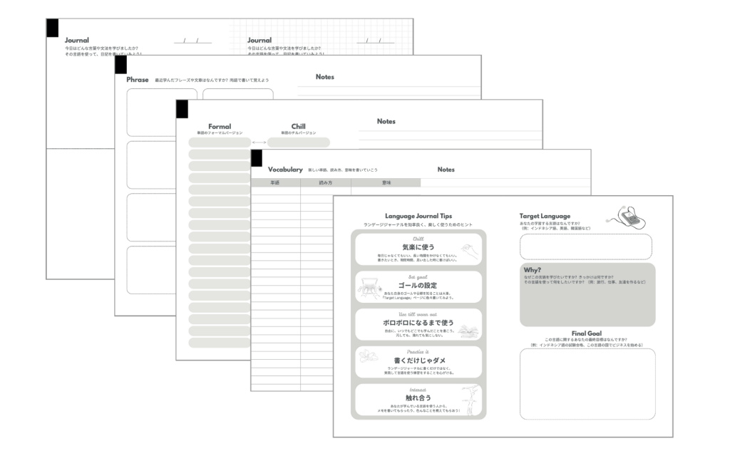 その前に、この度ランゲージジャーナルをプロデュースしました!こちらは語学勉強専用のノートで、目標設定や単語メモ、フレーズ記録が超やりやすいレイアウトになっているノートブックになります。使い方もノートブックの中に書いてあるので使いやすいかと思います!